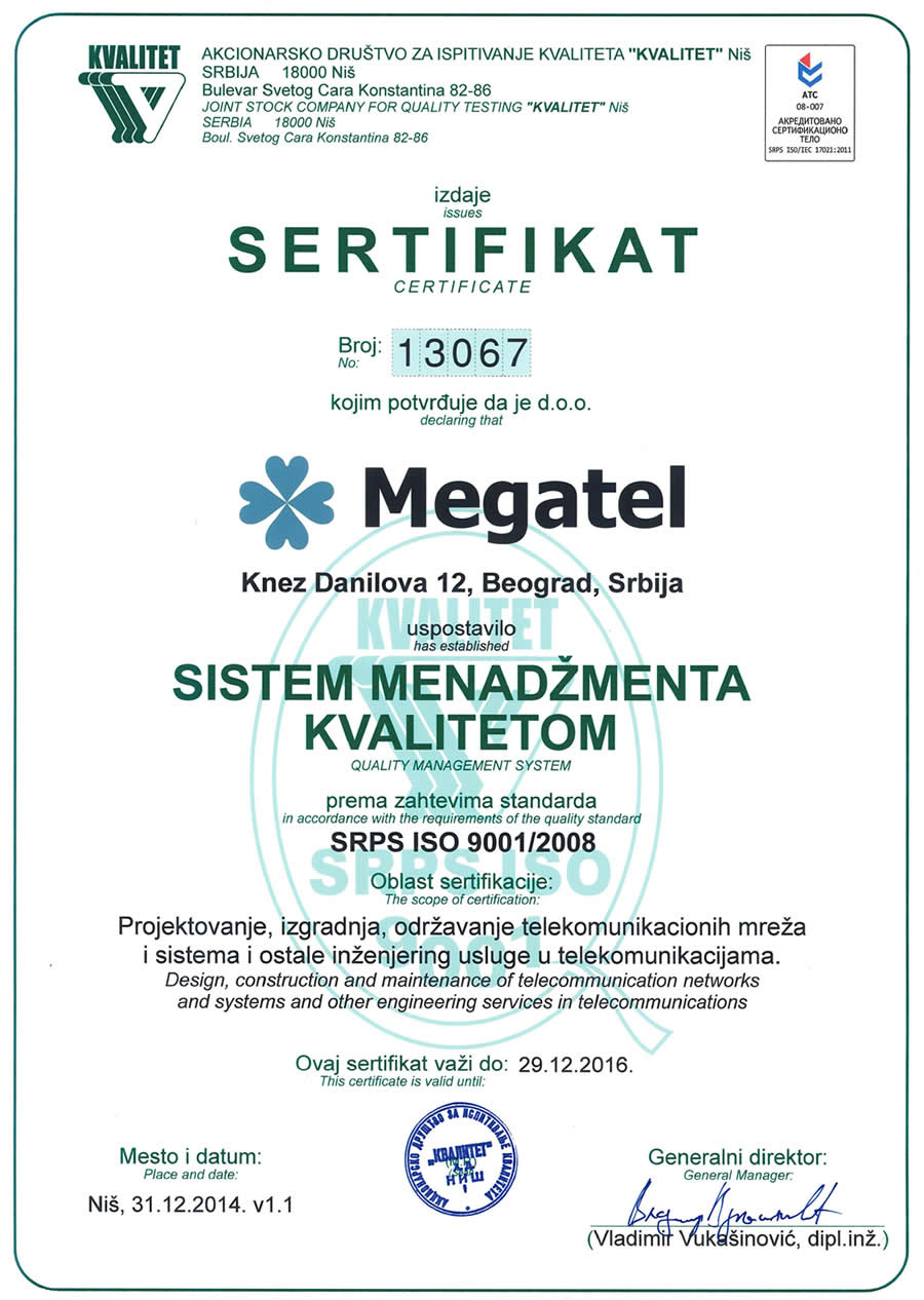 Preduzeće "MEGATEL" teži da obezbedi potpuno zadovoljenje zahteva, potreba i očekivanja korisnika koji stekne njihovo trajno poverenje, visokim kvalitetom svojih usluga u oblasti projektovanja, izgradnje i održavanja telekomunikacionih mreža i sistema, kao i stalnim poboljšavanjem sistema menadžmenta kvalitetom i povećanjem efektivnosti i efikasnosti kompletnog poslovanja preduzeća.